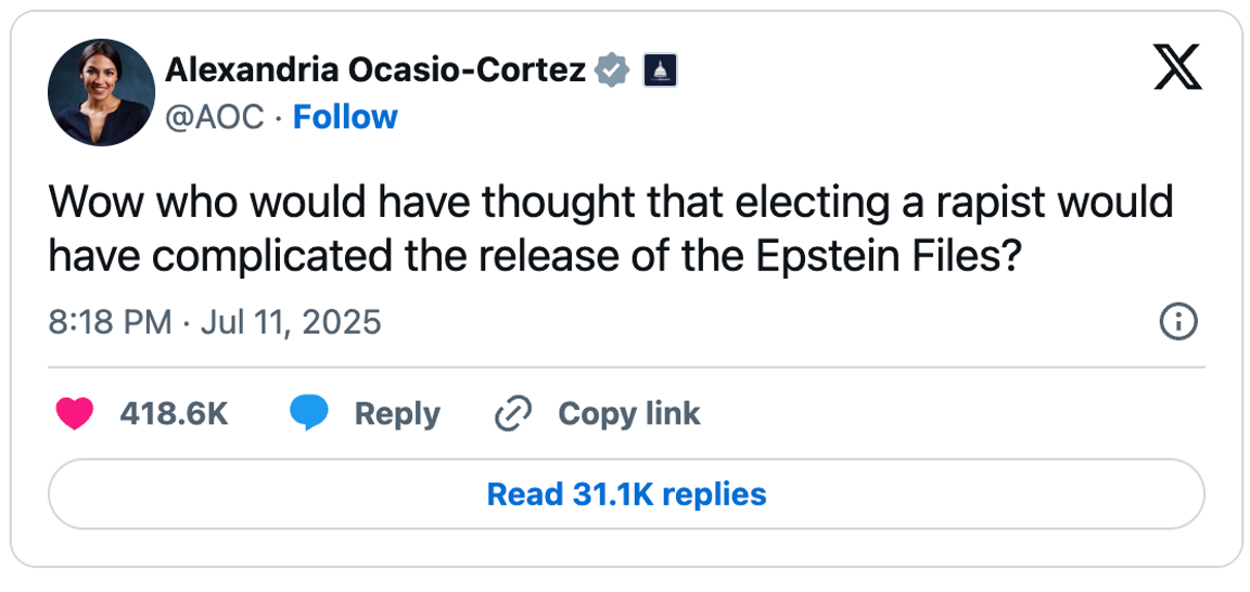 ”Wow, vem hade kunnat tro att välja en våldtäktsman skulle komplicera publiceringen av Epstein-filerna?” skrev Ocasio-Cortez.