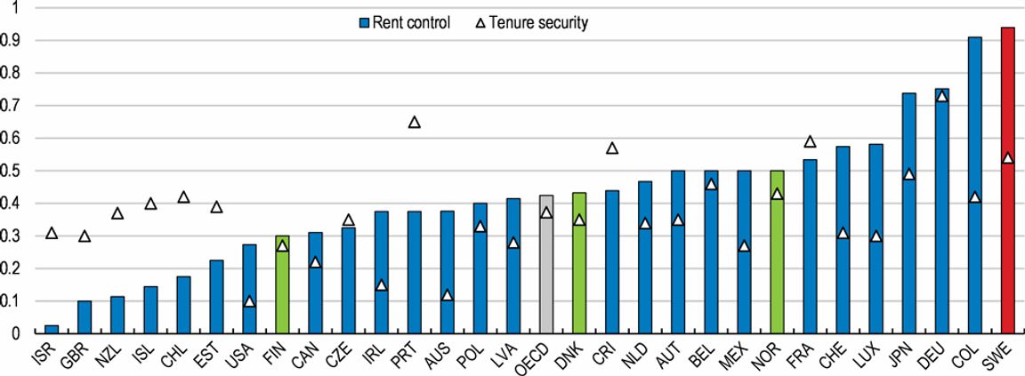 Organisationen hänvisar också till en bedömning från den svenska bostadsmyndigheten om att landet skulle ha omkring fyrtiotusen fler bostäder utan hyresregleringen. De anger dessutom att 44 procent av hushållen i nedersta inkomstkvintilen som bor i hyresrätt lägger mer än 40 procent av sin disponibla inkomst på hyra, vilket är högre än genomsnittet, rapporterar OECD.