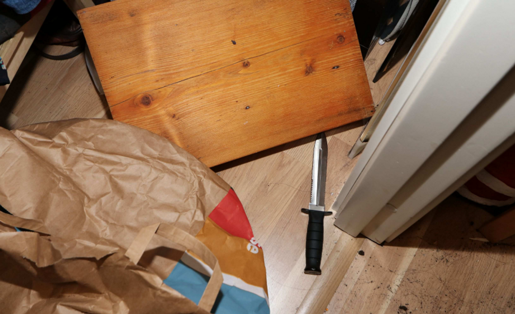 Polisens följande ingripande blir dramatiskt. En polisman tvingas forcera dörren, som pappan försöker hålla emot från andra sidan. När polismannen lyckats ta sig in upptäcker han att pappan har en kniv i brösthöjd, och använder sitt elchocksvapen för att neutralisera honom. Mannen tappar då kniven som visar sig varit inkörd i hans bröst, på 3-4 centimeters djup enligt den ingripande polisens uppskattning.