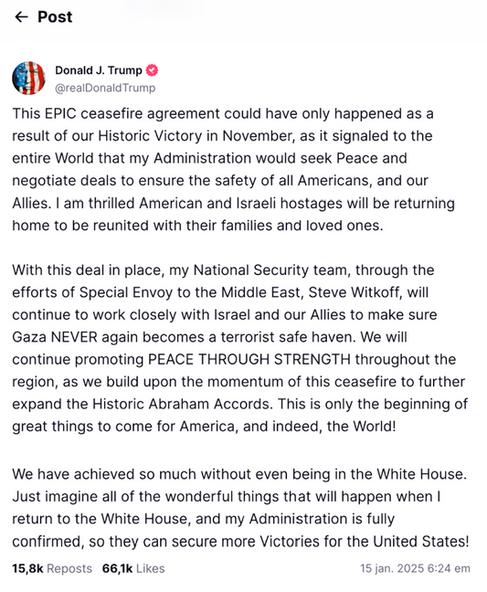 Donald Trump var snabb med att ta åt sig äran när avtalet blev känt på onsdagen. ”Det EPISKA avtalet om vapenvila var bara möjligt på grund av vår historiska valseger i november”, skrev han på Truth Social.
