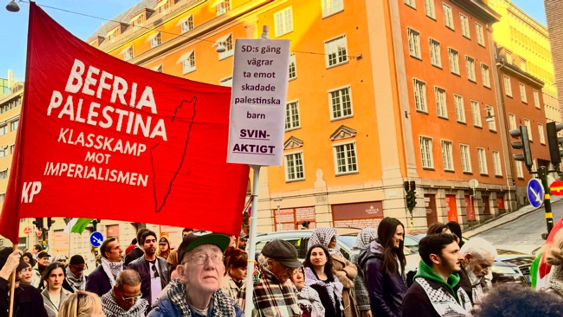 Ett annat plakat var arg på ”SD:s gäng” (Tidöpartierna, reds anm) för att man inte vill upplåta svensk sjukvård åt palestinier.
