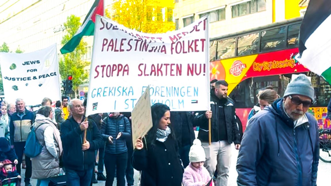 Närmare 1 000 (Bulletins uppskattning) antiisraeliska/antisemitiska/propalestinska demonstranter tågade genom Stockholm City på lördagseftermiddagen.