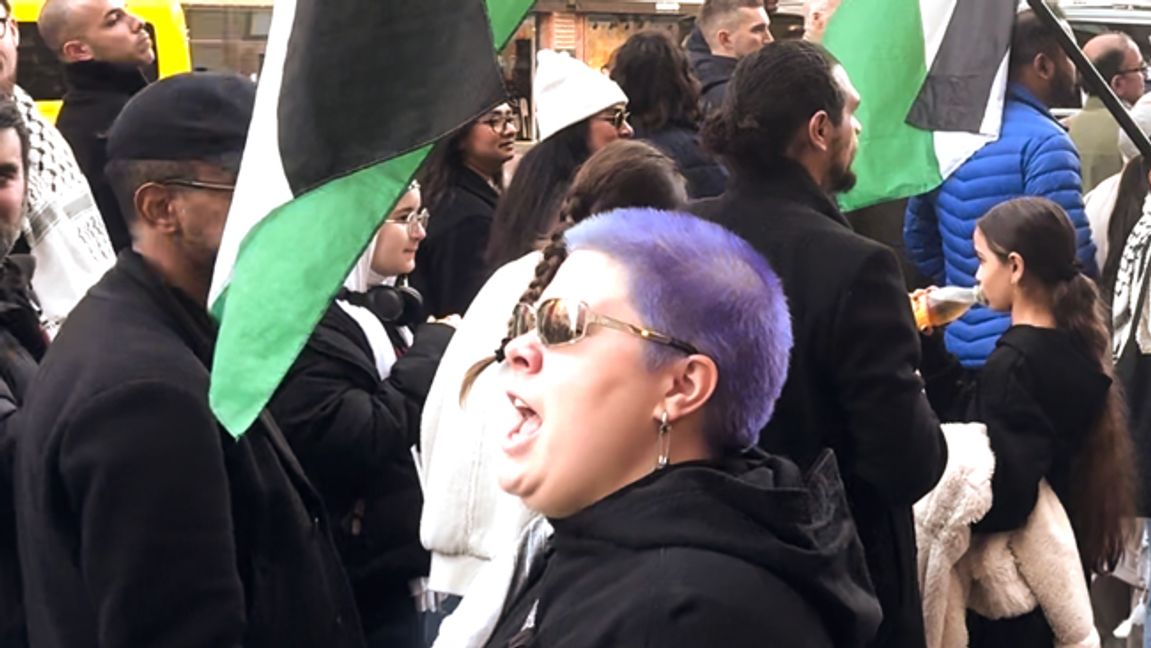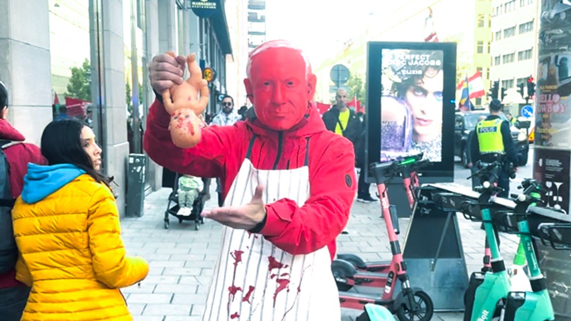 En ”blodig” Benjamin Netanyahu och en blåhårig kvinna som vrålade ”Inga sionister på våra gator”. Det var två av deltagarna som tågade med i ett demonstrationståg mot Israel genom centrala Stockholm på lördagen där även företrädare från Kommunistiska partiet deltog.
