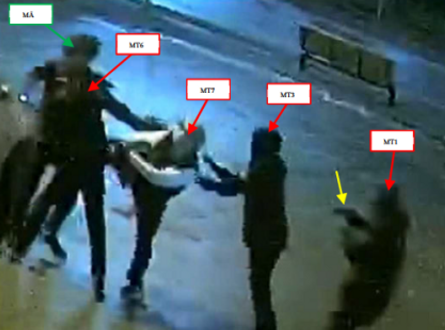 Gänget börjar avvisa 19-åringen från centrum med motivationshöjande knuffar mot parkeringen. Men han är motvillig, och när knuffarna övergår i sparkar och slag drar han upp en kniv som han sveper mot sina motståndare.