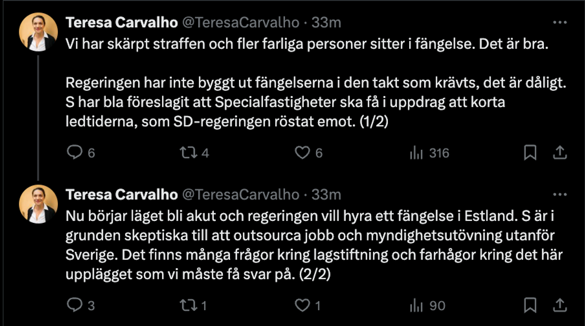 Socialdemokraternas rättspolitiska talesperson Teresa Carvalho var snabb med att kritisera regeringen efter dagens besked om fängelseplatser i Estland. Hon anser att beslutet är ett sätt för Tidöpartierna att ”outsourca” myndighetsjobb utanför Sverige.