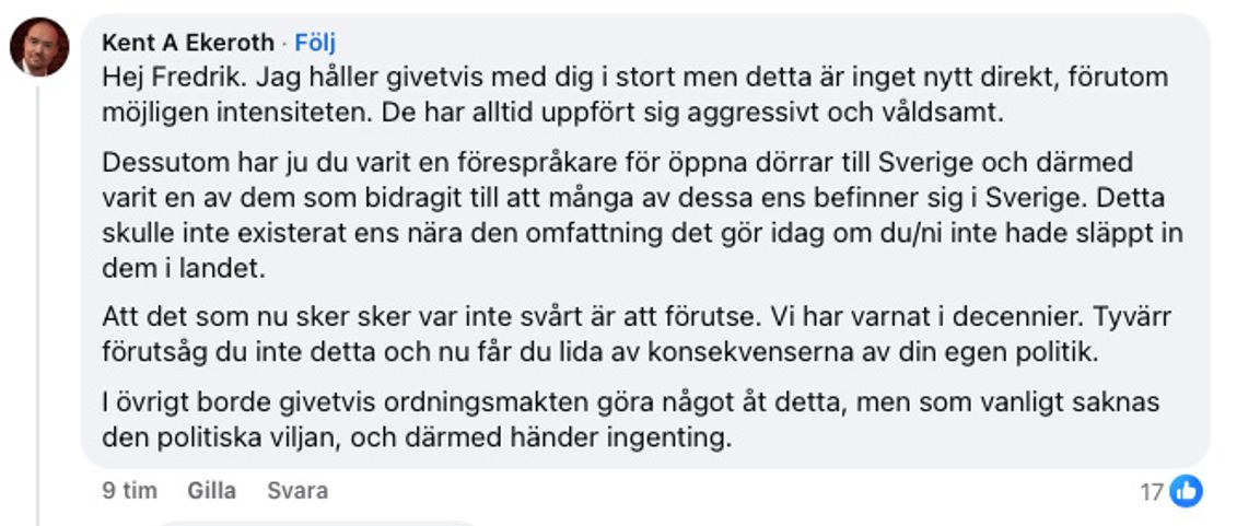 På Facebook skriver riksdagsledamoten Fredrik Malm (L) om hur han återkommande blivit utsatt av Palestinaaktivister och tvingats ta en annan väg till arbetet. Bland annat ger han ett exempel där han ”får en megafon och tre aktivister rakt i ansiktet som skriker att jag är folkmördare och sionist”. ”Tyvärr förutsåg du inte detta och nu får du lida av konsekvenserna av din egen politik”, kommenterar Kent Ekeroth (SD).