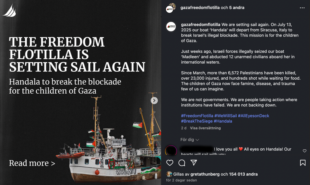 Freedom Flotilla meddelar på sociala medier att de kommer att sätta segel igen för att ta sig till Israels blockad av Gaza. Fartyget Handala ska avgå från Siracusa i Italien den 13 juli 2025, enligt organisationens Instagram-inlägg.