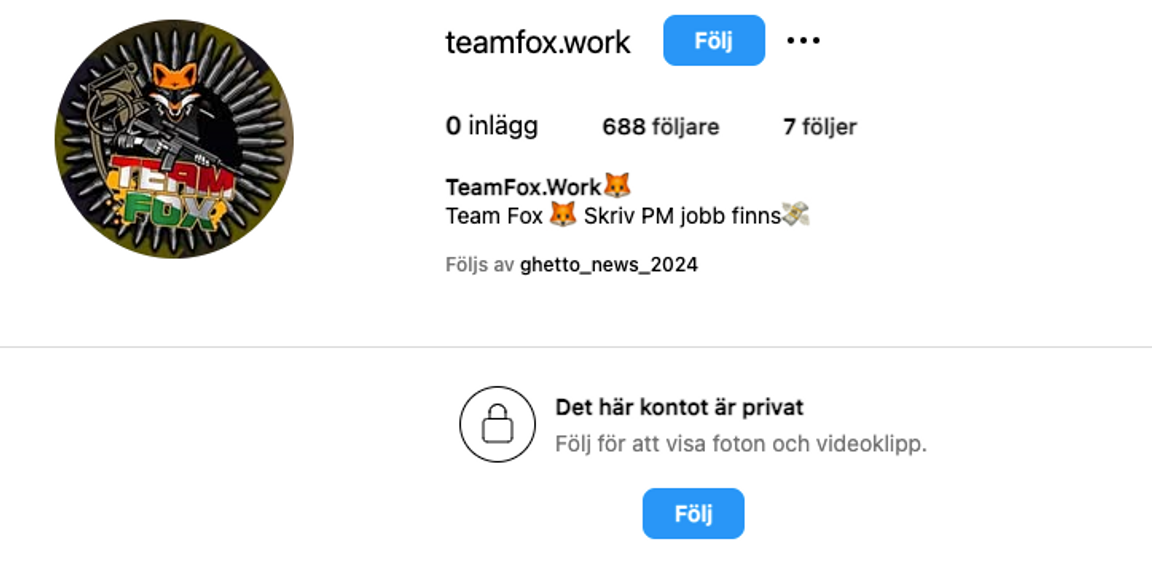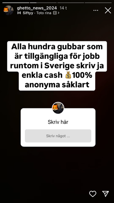 Texten kommer från en story på Instagram publicerad av kontot ”ghetto_news_2024” i december. Kontots profilbild är en person med en räv-emoji för ansiktet som håller ett vapen i ena handen.
