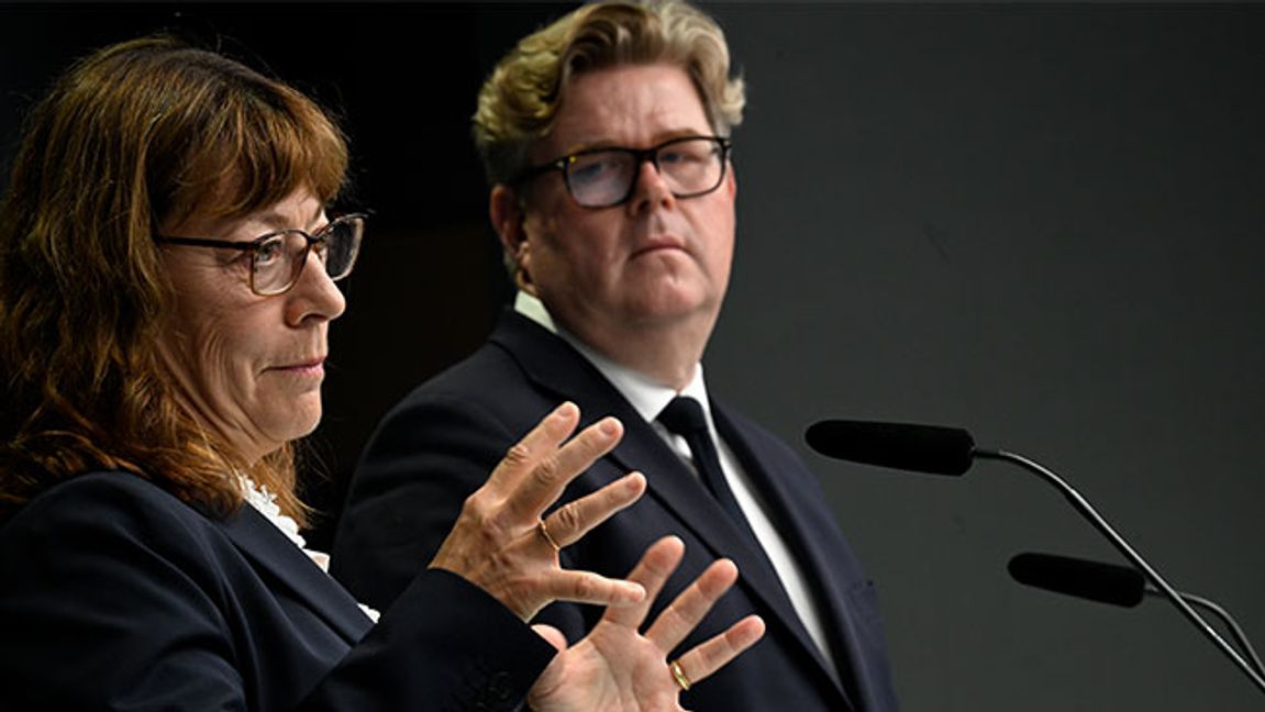 Lise Tamm och Gunnar Strömmer presenterar utredningen ”En översyn av de osjälvständiga brottsformerna” på rosenbad i september. Bild: Foto: Fredrik Sandberg / TT