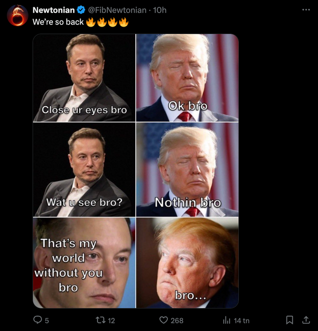 Och reaktionerna på inlägget väntade inte länge på sig. En användare passade på att uttrycka sitt nöje över den potentiella försoningen mellan Musk och Trump i form av en meme.