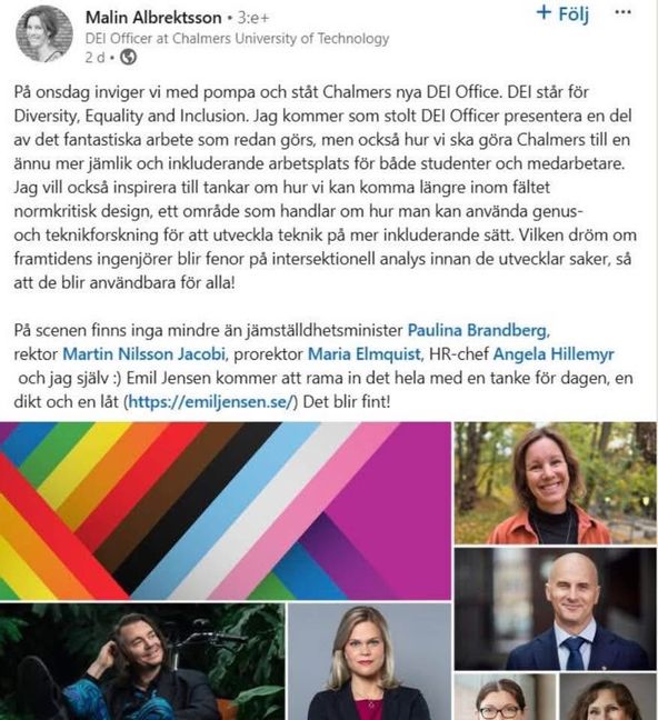 Chalmers meddelade i november i fjol att de skulle inrätta en ny funktion ”DEI officer” och fram till anmälan av festligheten när kontoret ska öppnas har det varit ganska tyst. Den tillträdande chefen skulle inför festligheten skriva på Linkedin och plötsligt blev Chalmers satsning något som exploderade i sociala medier. Men det som var festligt var egentligen inte festen utan något helt annat.