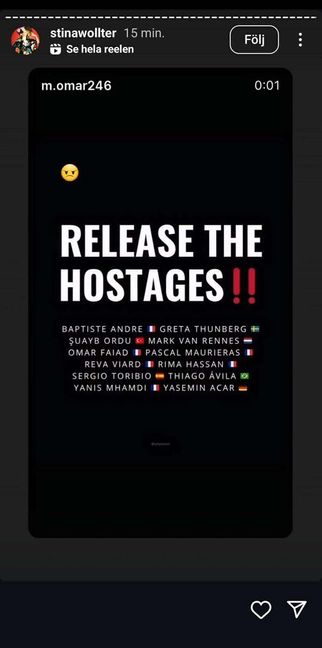 ”Om du ser detta har vi blivit stoppade och kidnappade på internationellt vatten av israeliska ockupationsstyrkor eller styrkor som stödjer Israel. Jag uppmanar alla mina vänner, kamrater och min familj att sätta press på den svenska regeringen för att jag och de andra ska släppas så snart som möjligt”, säger Greta Thunberg i en video på Instagram.