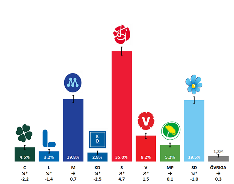 Ser man på de stora trenderna finns ett par mönster som är intressanta. Socialdemokraterna gick kraftigt fram efter valet. I maj i fjol hade de 38,6 procent, i förra valet 30,3 procent. Skillnaden mellan oppostionsläget och valresultatet har halverats, nu har de stöd av 35 procent. Förmodligen finns både en mer positiv syn på regeringen och en ökande negativ syn på hur partiet agerar i opposition.