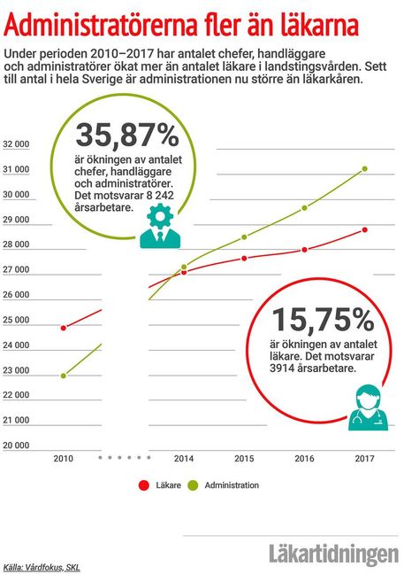 Redan 2018 rapporterade Läkartidningen om att administratörerna hade blivit fler än läkarna. För varje läkare fanns fler än en administratör. Administratörerna har dessutom en snabbare tillväxt så deras försprång växer.