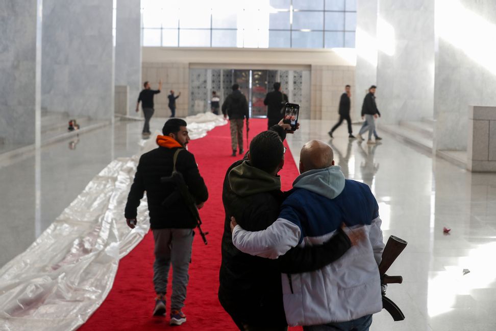 Några kilometer därifrån har människor stormat presidentpalatset. Porträtt på den nu störtade presidenten Bashar al-Assad, som visar hur han tar emot statsöverhuvuden, uppges ha tagits ned från väggarna. Filmer visar hur plundrare lämnar palatset med tallrikar och andra hushållsartiklar.