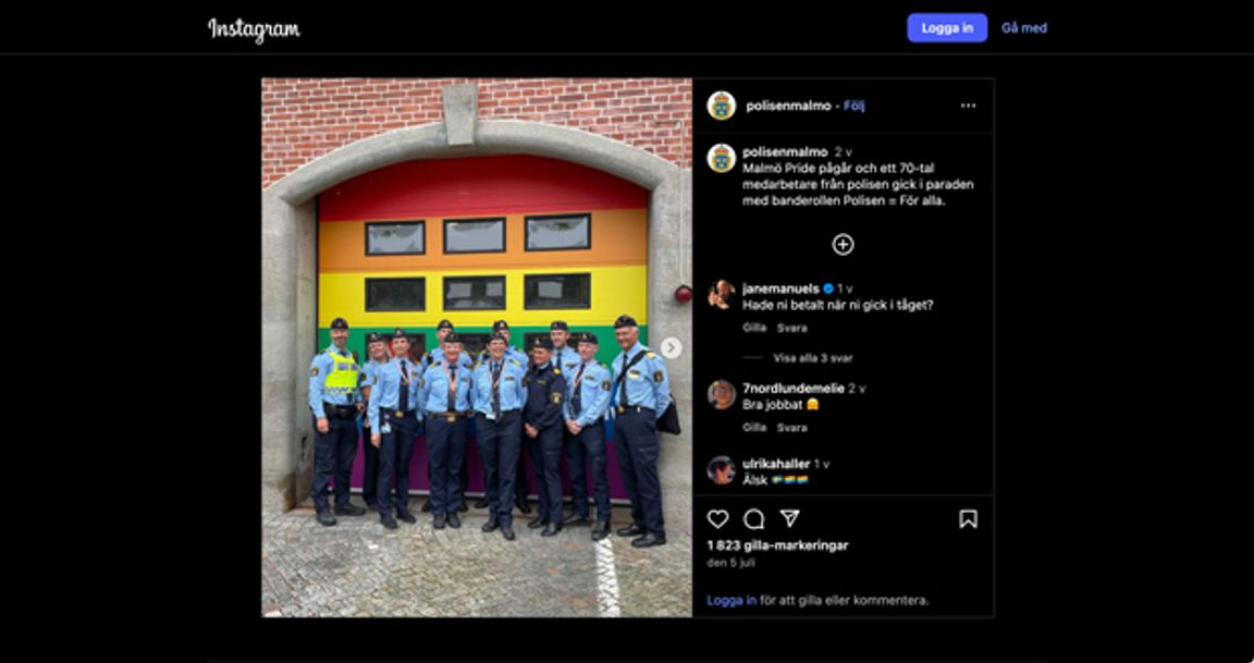 Under Malmö Pride den 5 juli deltog omkring 70 polisanställda i paraden, något som uppmärksammades i ett inlägg på Instagram. I bilden poserar uniformerade poliser framför en regnbågsfärgad garageport, med texten: ”Polisen = För alla.”