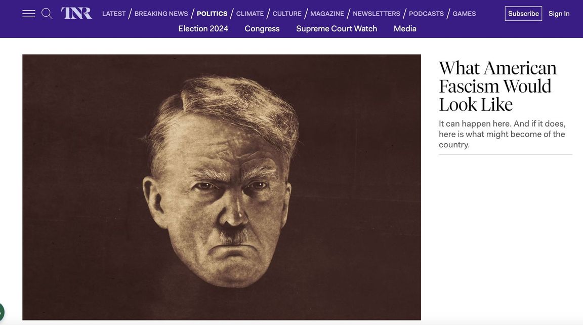 Men det slutar inte. Det är inte mer än några dagar sedan som den amerikanska vänstertidskriften The New Republic publicerade en karikatyr av Trump som Hitler. Jämförelserna med Hitler har varit vanliga, också i Sverige.