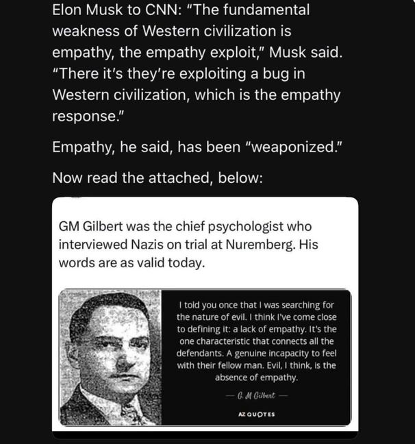 Under detta mycket medvetet klippta citat, där Musk framstår som hjärtlös och ondskefull, trots att det han sa om empati i sin helhet visar på något annat, finns ett citat som tillskrivs Gustave Gilbert, chefspsykologen som intervjuade de åtalade krigsförbrytarna i Nürnbergrättegången. Ondskans natur, påstås Gilbert hävda, är brist på empati. Det var oförmågan att känna empati som kännetecknade de nazistiska krigsförbrytarna.