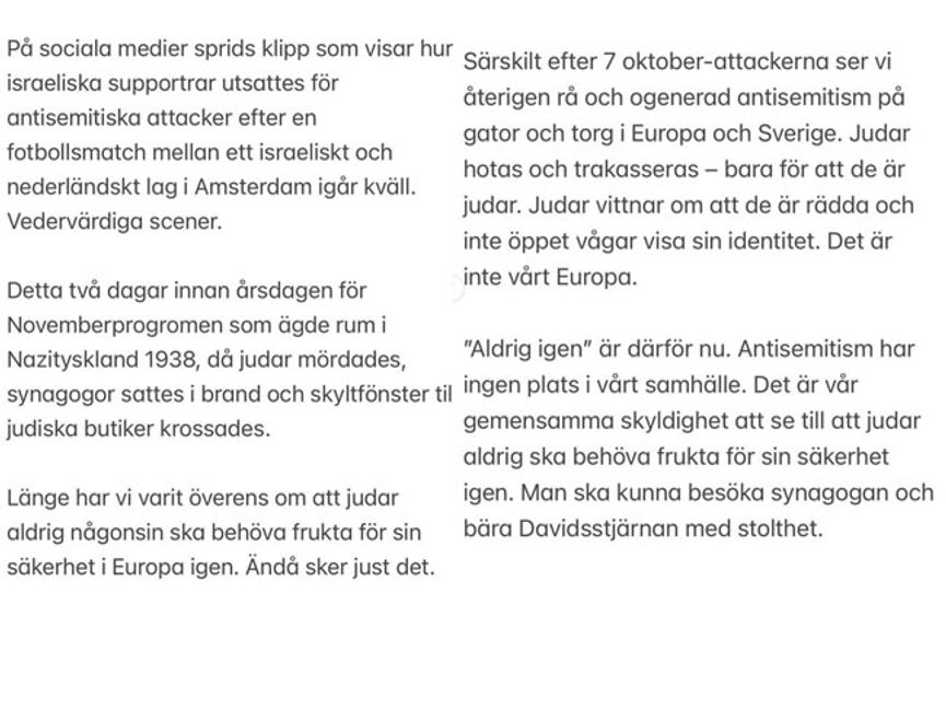 Statsministern är tydlig med sin ståndpunkt: ”Antisemitism har ingen plats i vårt samhälle.” I sitt inlägg betonar han det gemensamma ansvaret: ”Det är vår gemensamma skyldighet att se till att judar aldrig ska behöva frukta för sin säkerhet igen. Man ska kunna besöka synagogan och bära Davidsstjärnan med stolthet.”