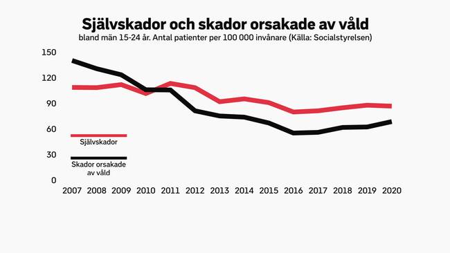Enligt SVT visade siffrorna att det är fyra gånger vanligare att en person vårdas på sjukhus för självskador än för att ha utsatts av våld av någon annan person.