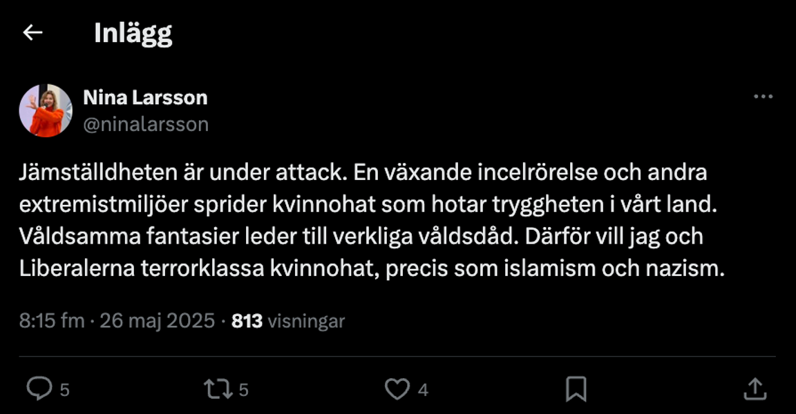 På X utvecklar ministern resonemanget och skriver att ”en växande incelrörelse och andra extremistmiljöer sprider kvinnohat som hotar tryggheten i vårt land”.