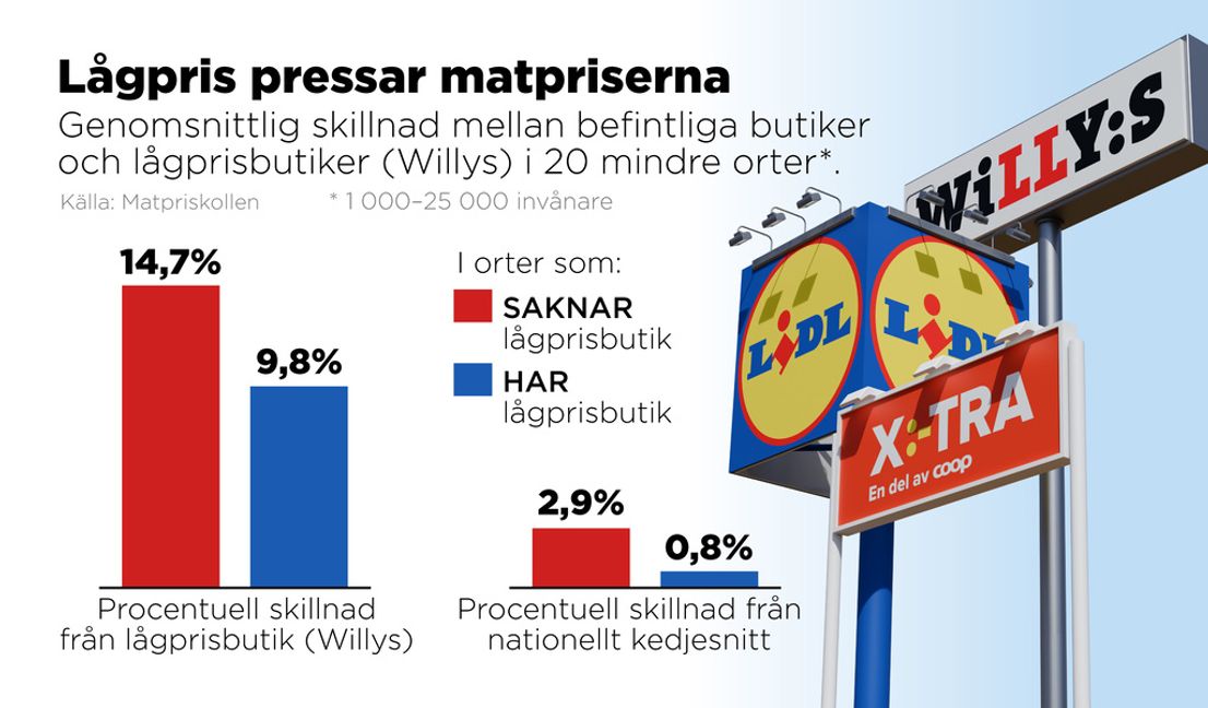 Där det bara finns en lågprisbutik har stormarknaden 5,3 procent högre priser. Om det finns fyra eller fem lågprisbutiker i området blir skillnaden cirka 3–4 procent.