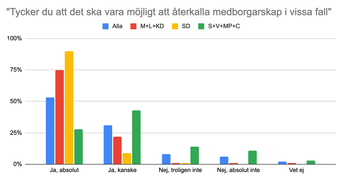 Skillnaderna mellan väljargrupper är betydande. 99 procent av Sverigedemokraternas väljare och 97 procent av regeringspartiernas väljare stödjer återkallelse. Hos oppositionen (S, V, MP, C) stödjer 71 procent förslaget medan 25 procent motsätter sig det. [KÄLLA: Fokus, stycke 4]