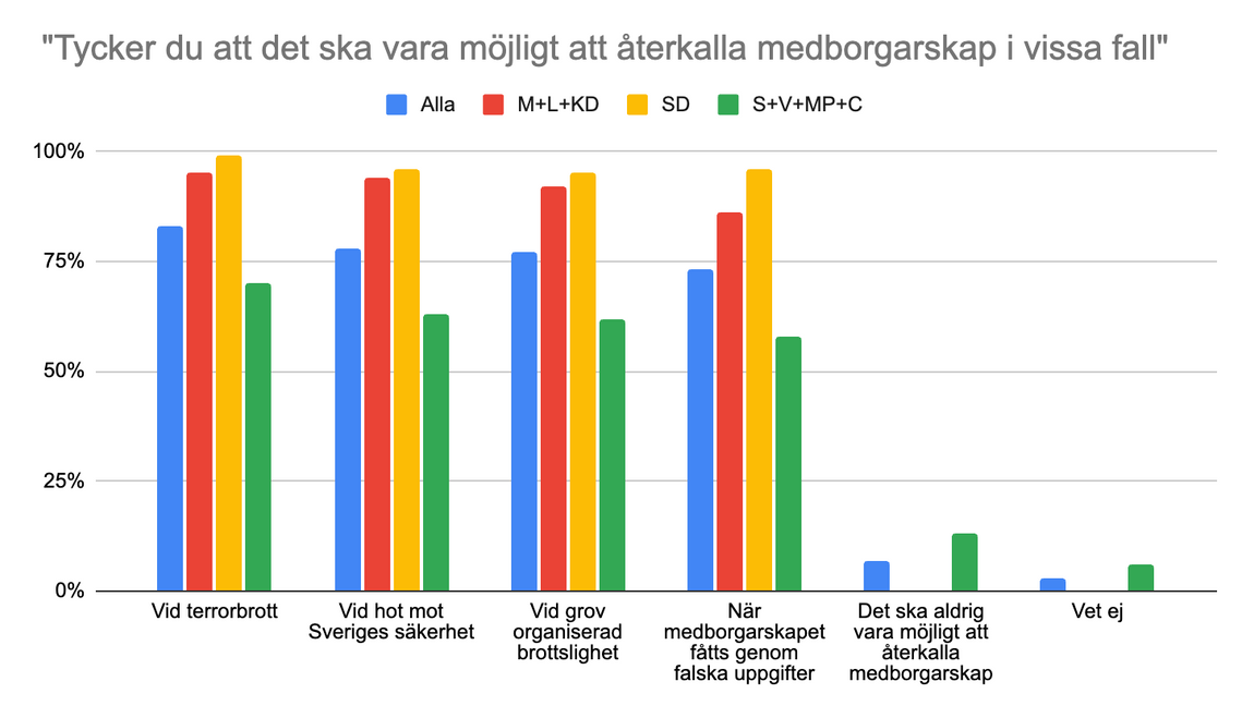 Stödet är starkt för återkallelse vid terrorbrott (83 procent), brott mot rikets säkerhet (78 procent) och när medborgarskap erhållits genom falska uppgifter (73 procent). Även utrikes födda stödjer förslagen, om än i något lägre grad.