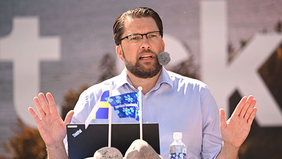 Jimmie Åkesson talar under Almedalsveckan 2022. Foto Henrik Montgomery / TT