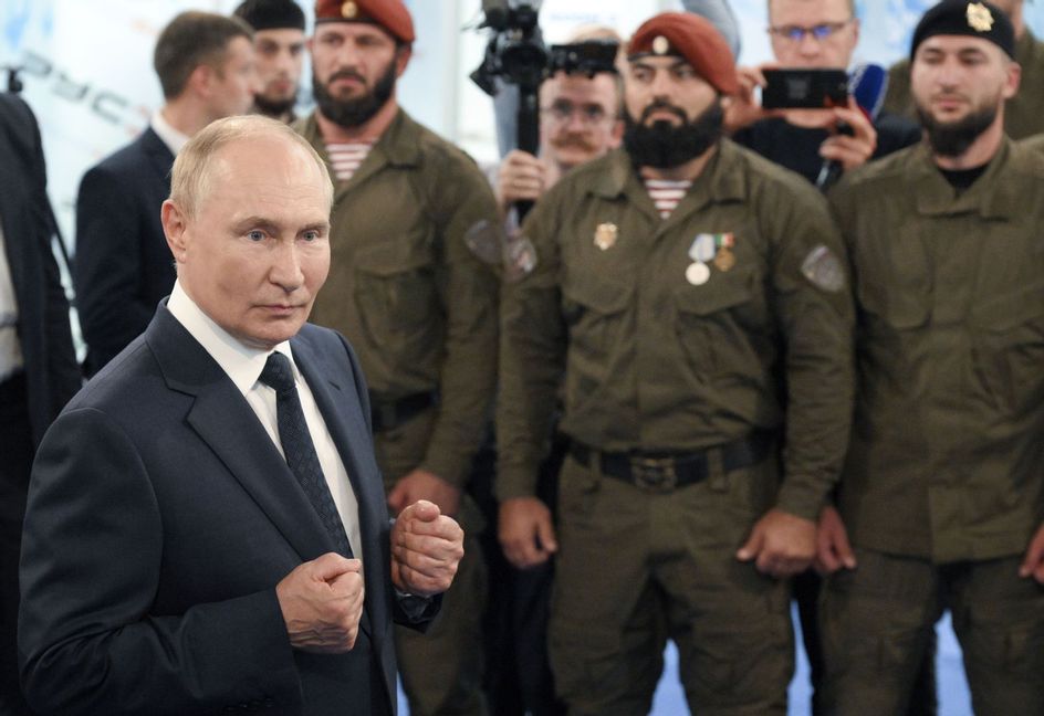 Rysslands president Vladimir Putin besöker Specialstyrkonas universitet i Gudermes, Tjetjenien och pratar med tjetjenska militärer den 20 augusti 2024. Foto: Alexei Danichev, Sputnik, Kremlin Pool Photo via AP