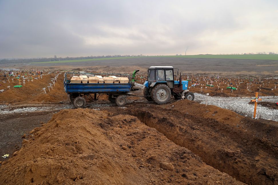 En traktor kör ytterligare kistor med oidentifierade kroppar från människor som dödades under de hårda striderna våren 2022 och som tillfälligt begravdes inne i staden och som här begravs mer permanent på kyrkogården utanför själva staden Mariupol. Det är den 24 december 2022. Foto: AP Photo/Alexei Alexandrov