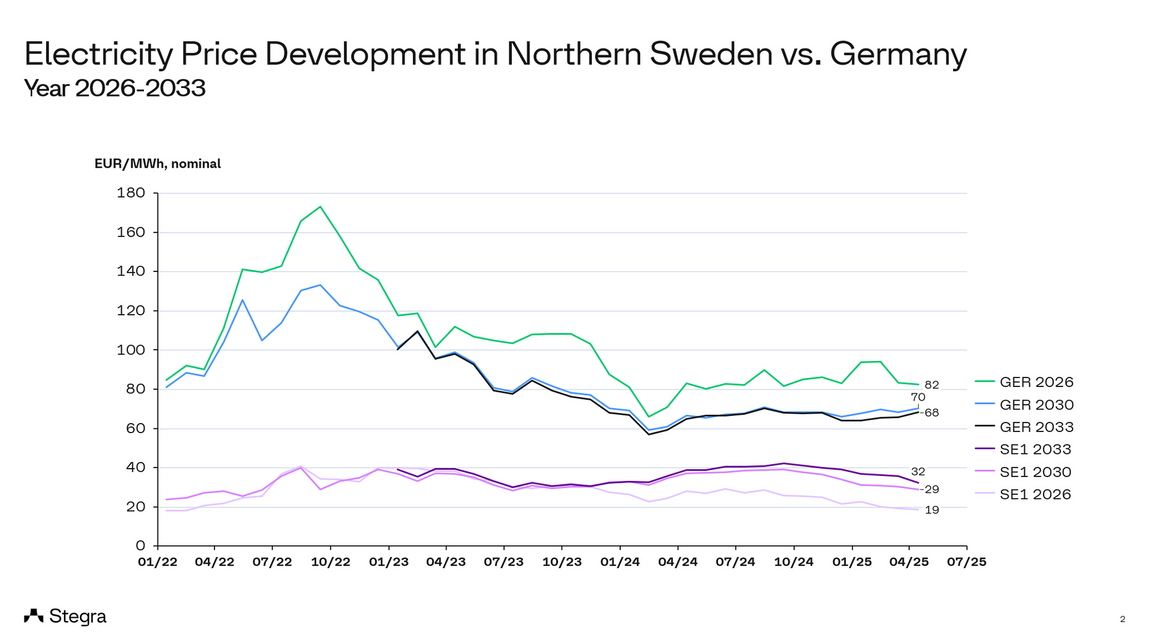 ”Idag har läget förbättrats på många sätt sedan januari 2024 avseende Stegras elkostnad i Boden. Utöver den förväntade ökningen av produktionsöverskottet (från 45-50 TWh i prisområde SE1+SE2 till närmare 60 TWh till 2027) så har vi sista året sett en mängd försenade eller nedlagda industriprojekt i Norrbotten. Detta i kombination med kortsiktigt gott hydrologiskt läge i Norden (överskott av vattenkraft) och sviktande omvärldskonjunktur har pressat elpriserna ytterligare.”