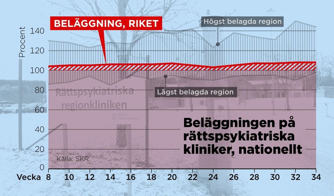 Nationellt är beläggningen på rättspsyk 108 procent, enligt de senaste siffrorna från SKR. Regionen med lägst beläggning ligger på 98 procent, högst är en region med 144 procent.