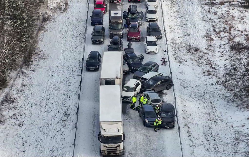 På polisens egna drönarbilder syns hur många fordon totalförtördes.