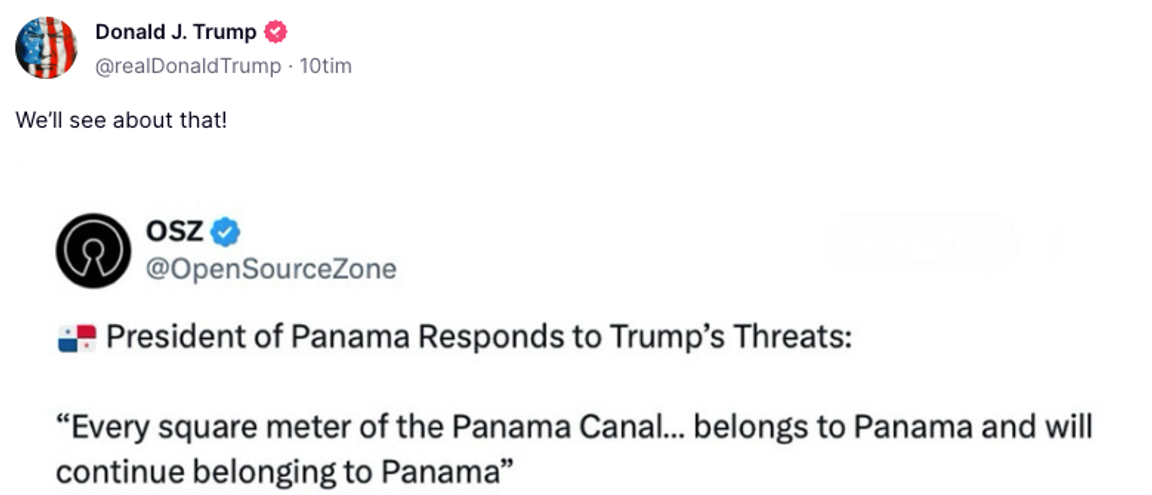 Efter Mulinos löfte om att behålla kanalen under panamansk flagg har Trump kommit med ytterligare ett utspel på Truth Social.
