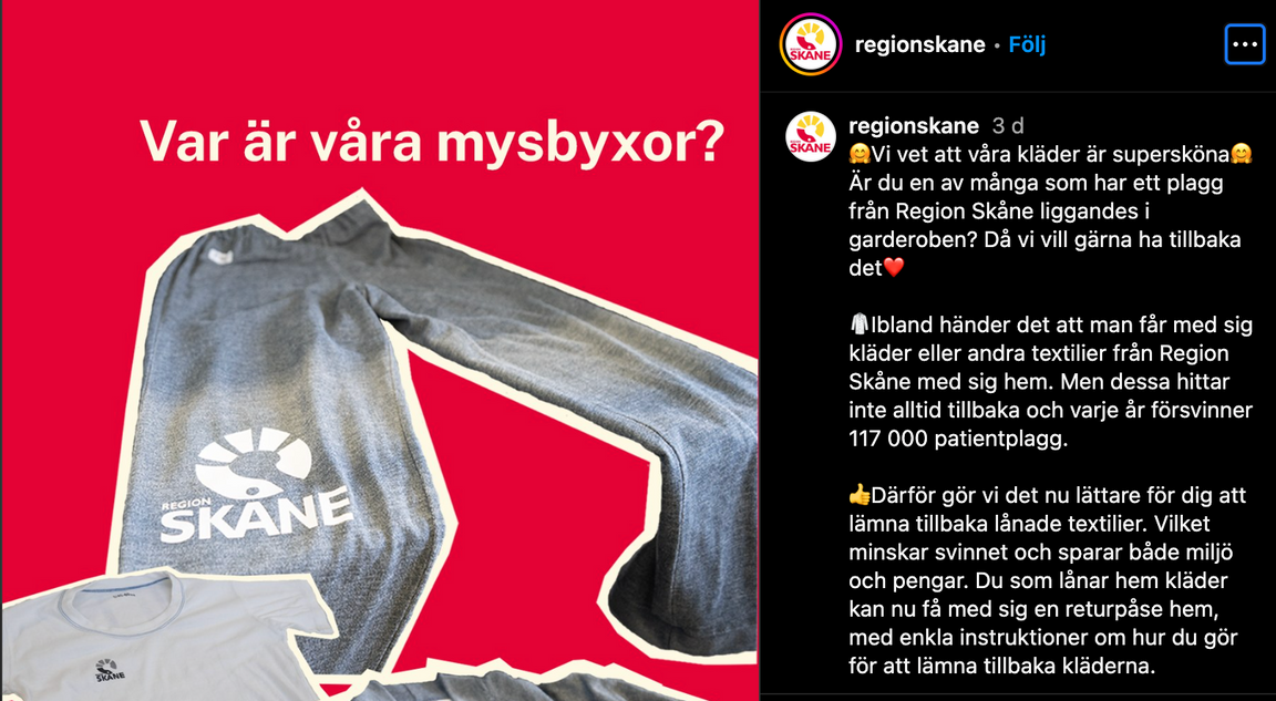 Region Skåne vädjar till sina tidigare patienter i ett inlägg på Instagram. ”Var är våra mysbyxor?”, skriver de och syftar på de många patientplagg som aldrig återlämnas efter sjukhusvistelser. Det var TV4 Nyheterna som först rapporterade om detta.