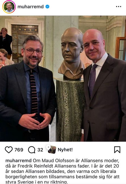På Instagram hyllas Fredrik Reinfeldt av Centerpartiets Muharrem Demirok i samband med att bysten avtäckts.