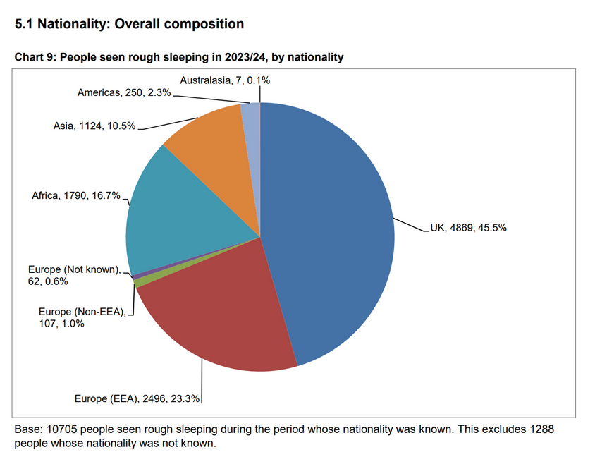 • 45 procent av uteliggarna under 2023/24 var brittiska medborgare jämfört med 49 procent 2022/23.