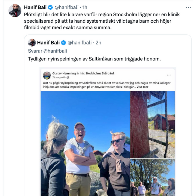 ”Plötsligt blir det lite klarare varför region Stockholm lägger ner en klinik specialiserad på att ta hand systematiskt våldtagna barn och höjer filmbidraget med exakt samma summa.”