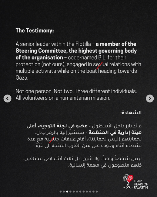 Aktivistorganisationen Team Heart of Falastin publicerade under söndagen allvarliga anklagelser mot en namngiven styrelsemedlem i Global Sumud Flotilla (GSF) på sociala medier – flotiljan som förra hösten försökte bryta Israels blockad av Gaza, och vars vårexpedition avgick från Barcelona så sent som i söndags.