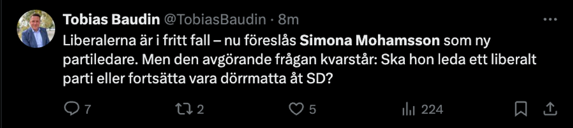 Socialdemokraternas partisekreterare Tobias Baudin var inte lika snabb med gratulationerna. I ett inlägg på X skriver S-politikern att ”Liberalerna är i fritt fall” och ställer sig frågan om Simona Mohamsson kommer att ”leda ett liberalt parti eller fortsätta vara dörrmatta åt SD?”.