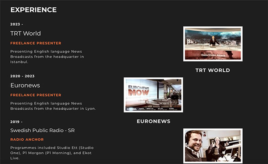 Men Sveriges public service-kanaler är inte de enda han hunnit jobba för på senare år. Han har även frilansat som nyhetsankare för turkiska TRT World. Hans arbete där syns bland annat i en video han själv laddat upp på Youtube.
