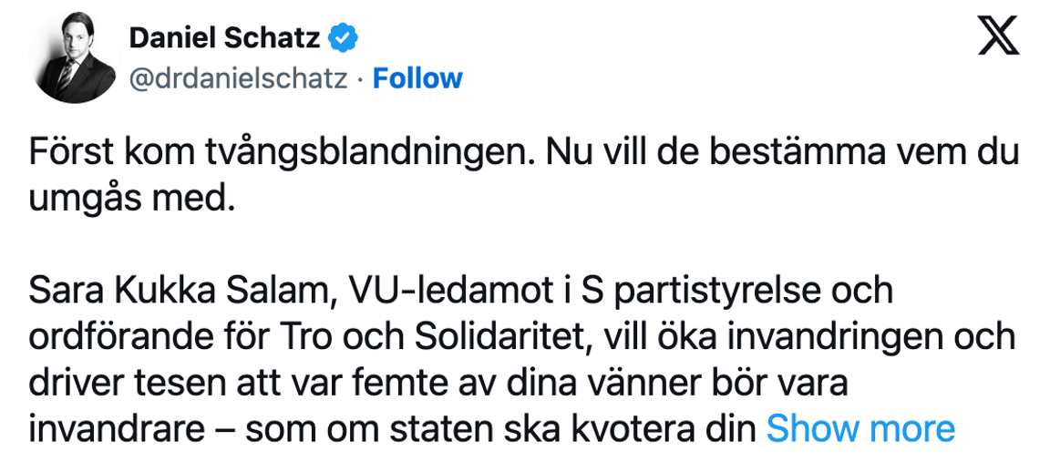 Det politiska X-kontot Ledarsidorna skriver i ett inlägg med en varning för långsiktiga konsekvenser och skriver att utspelet öppnar för framtida lagstiftning om vem medborgare får umgås med.