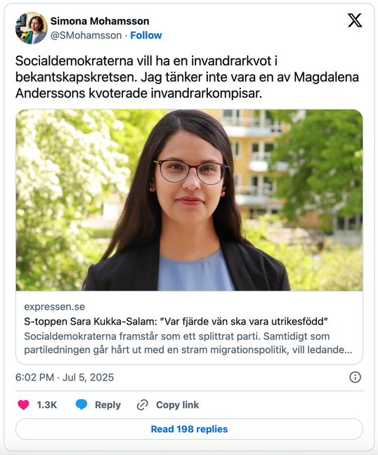 Liberalernas nye partiledare Simona Mohamsson är en av flera som kritiserar Kukka-Salams utspel. I ett inlägg på X skriver L-ledaren att hon ”inte tänker vara en av Magdalena Anderssons kvoterade invandrarkompisar.”