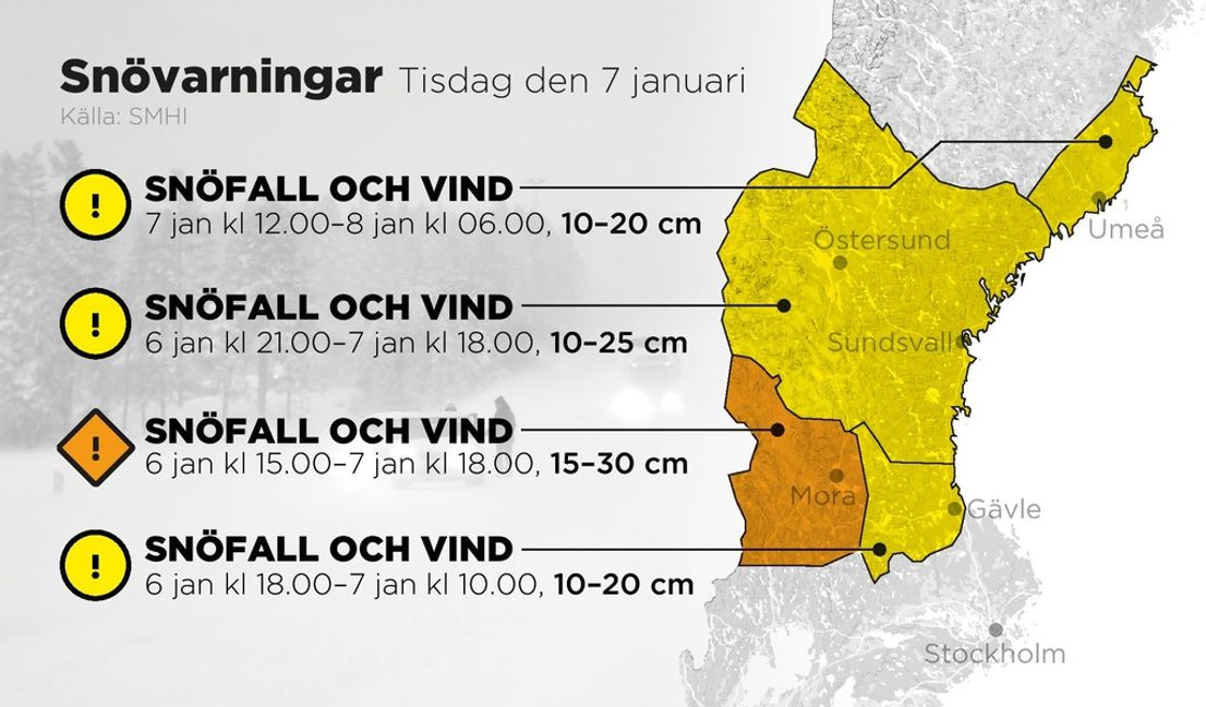 I södra Norrland ligger den gula varningen för snöfall i kombination med vind kvar fram till kvällen. Under tisdagen väntas snöfallet bli kraftigt i Västernorrlands och norra Jämtlands län. Fram till kvällen väntas 10–20 centimeter snö.
