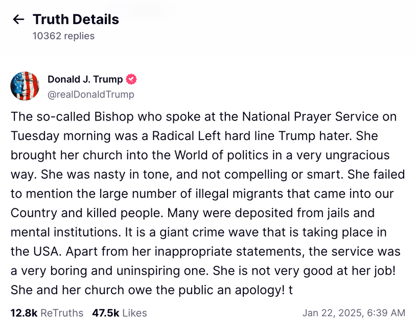 Trump själv gick snabbt till motattack på sin plattform Truth Social, där han stämplade biskopen som ”en hård Trump-hatare” och krävde en offentlig ursäkt.