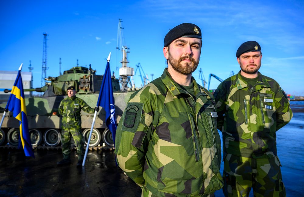 Halv tio lokal tid landsteg de första svenska soldaterna i Riga på två led, ett med svenska flaggan främst och ett med Natoflaggan. De ska delta i Sveriges första markinsats som Natoallierad.