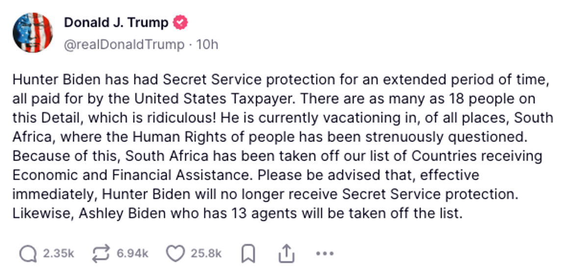 Vidare noterar han att den forne presidentens son semestrar i Sydafrika, som USA nyligen har dragit in allt ekonomiskt stöd till. I inlägget skriver Trump att även Joe Bidens dotter, Ashley Biden, inte längre kommer att omfattas av skydd från Secret Service.
