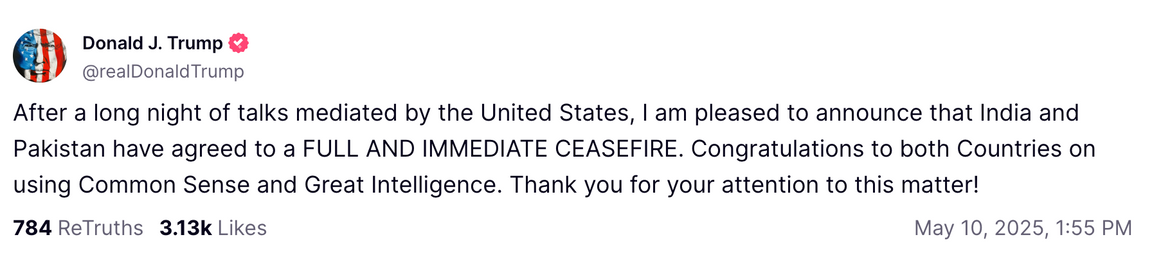 ”Indien och Pakistan har kommit överens om en FULLSTÄNDIG OCH OMEDELBAR VAPENVILA. Gratulationer till båda länderna för att de använt sunt förnuft och stor intelligens”, skriver Trump i sitt inlägg på plattformen.