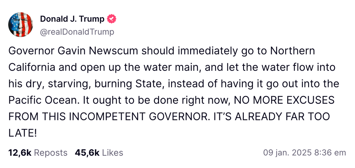 Medan Los Angeles i Kalifornien härjas av förödande bränder går den tillträdande presidenten Donald Trump till hårt angrepp mot Kaliforniens demokratiske guvernör Gavin Newsom, skriver tidningen Le Monde.